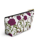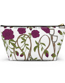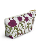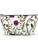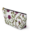 A small, structured accessory pouch that carries a garden of calm wherever you go. The T-bottom shape gives it a steady base—it stands up on a dresser or inside a tote so you can find your essentials without digging. The surface shows a hand-drawn vine and rose motif in deep plum and olive green on a clean white field. Inside, a non-woven laminate adds subtle structure and protects contents from snags, while the matching zipper with a gold puller gives a graceful, finished touch. Light enough for daily carry, sturdy enough to hold makeup, tools, or craft supplies, it slips into backpacks, work bags, or travel cases and brings a small, cultivated moment to everyday routines.