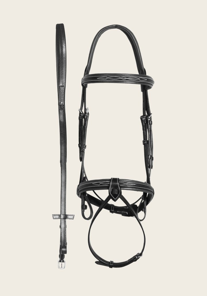 A fancy stitch detail on the browband and noseband of this bridle finishes this design with elegance and style. A matching pair of rubber reins with a fancy stitch detail is included with this product. This bridle is made from ...