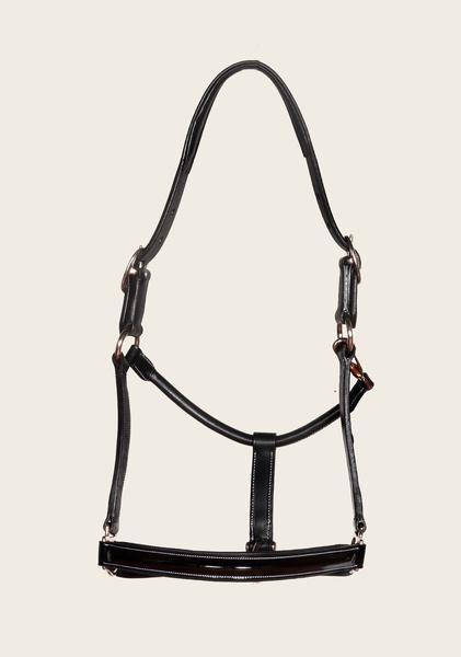 A beautiful combination of padded and patent leather makes this halter a beautiful addition the the Espoir leather collection. This halter is made from the highest quality Italian cow leather, finished with white contrast stitc...