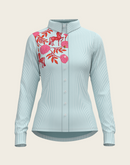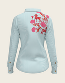 Peony in Pink on Blue Stripes Ladies Casual Button Shirt