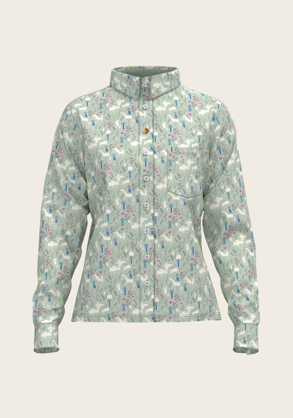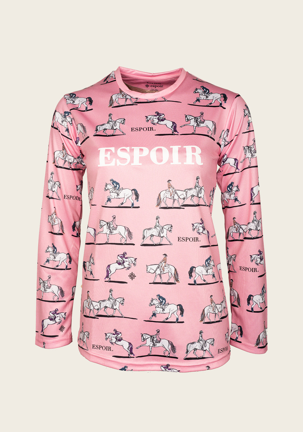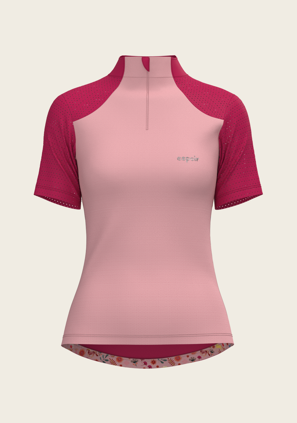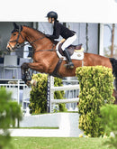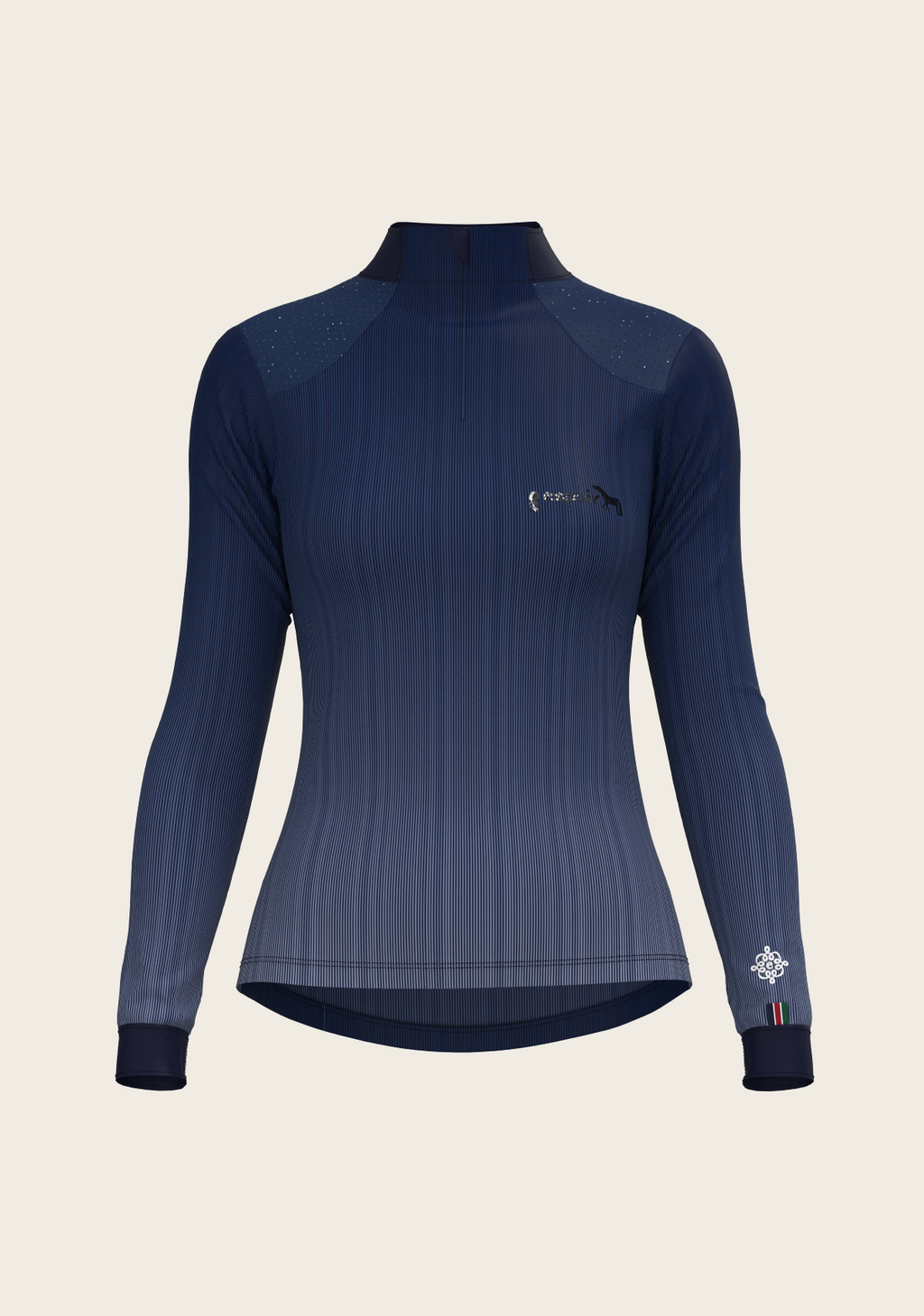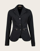 A fitted show jacket made from a lightweight stretchable fabric, stylishly executed with princess style lines. The front panel is closed with beautiful custom Espoir buttons which match smaller buttons on each sleeve.Tone on tone details on the collar and front pocket zips add sophisticated details to this jacket. A sporty, sophisticated styled equestrian jacket.