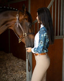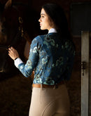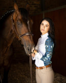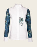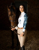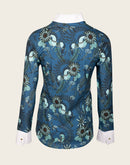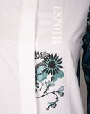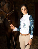 A beautiful buttoned show shirt made from a technical sports fabric with a four way stretch and UV protection. A white front center panel covers the buttons in the middle. The standup white show collar is well constructed to keep retain its shape and finished off with a golden Espoir custom button. The structured cuffs are finished off with custom Espoir gold buttons. All designs are hand illustrated. A proudly South African designed and produced garment.