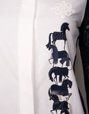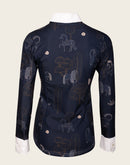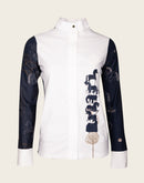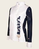 A beautiful buttoned show shirt made from a technical sports fabric with a four way stretch and UV protection. A white front center panel covers the buttons in the middle. The standup white show collar is well constructed to keep retain its shape and finished off with a golden Espoir custom button. The structured cuffs are finished off with custom Espoir gold buttons. All designs are hand illustrated. A proudly South African designed and produced garment.