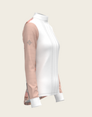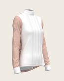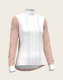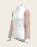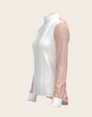 A formal looking show shirt made from luxurious technical fabrics. A hidden quarter zip is neatly constructed by a printed inner detailed fabric. On the front chest there is a Swarovski logo detail. Two hidden stud buttons easily closes the top collar. The inner collar and cuffs have hidden printed details. Cuffs have the custom Espoir button and the back of the collar, our signature Espoir ribbon detail. These show shirts are available in long and short sleeve.