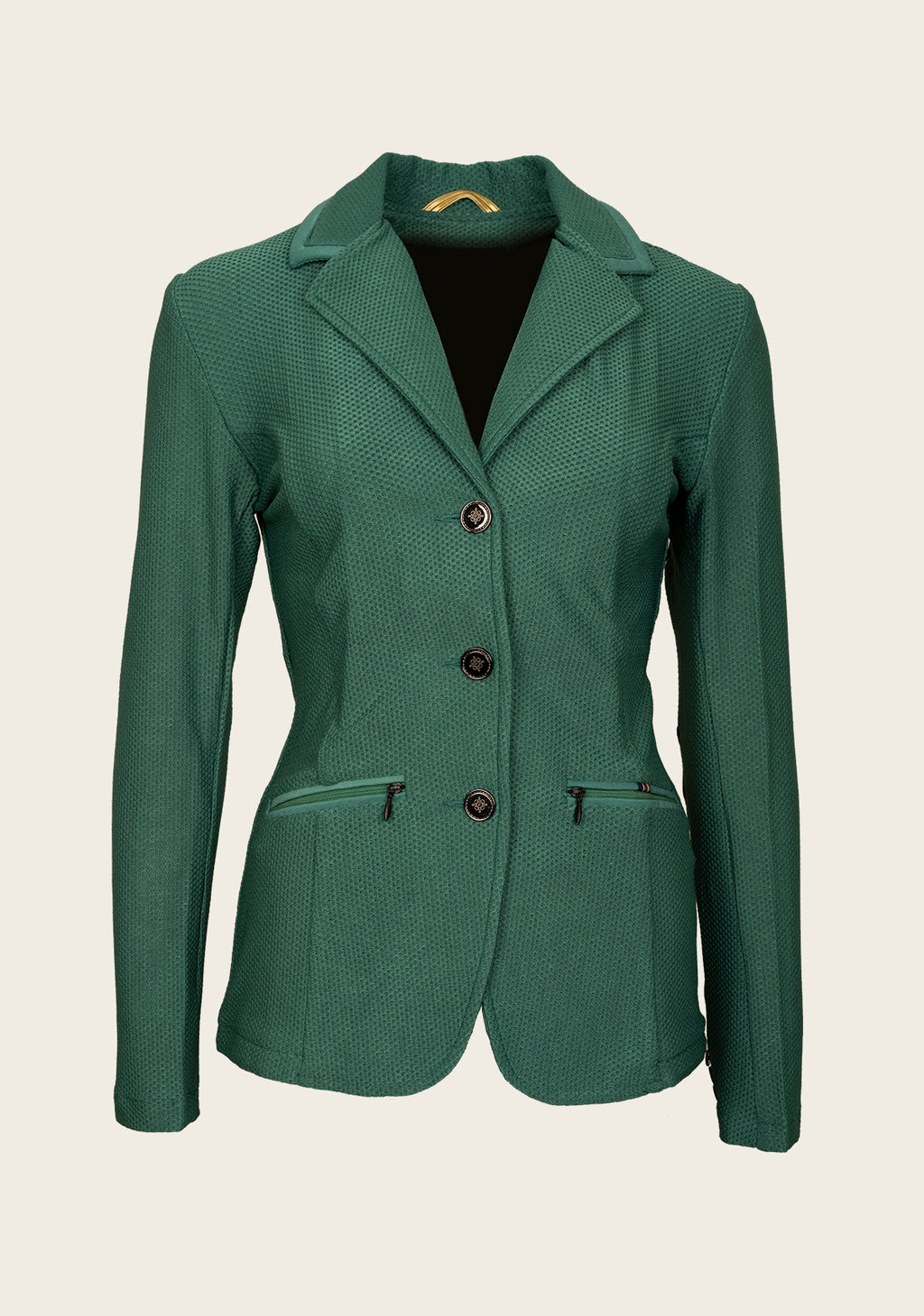 A fitted show jacket made from a durable mesh fabric, stylishly executed with princess style lines. The front panel is closed with beautiful custom Espoir buttons which match smaller buttons on each sleeve. Tone on tone piping ...