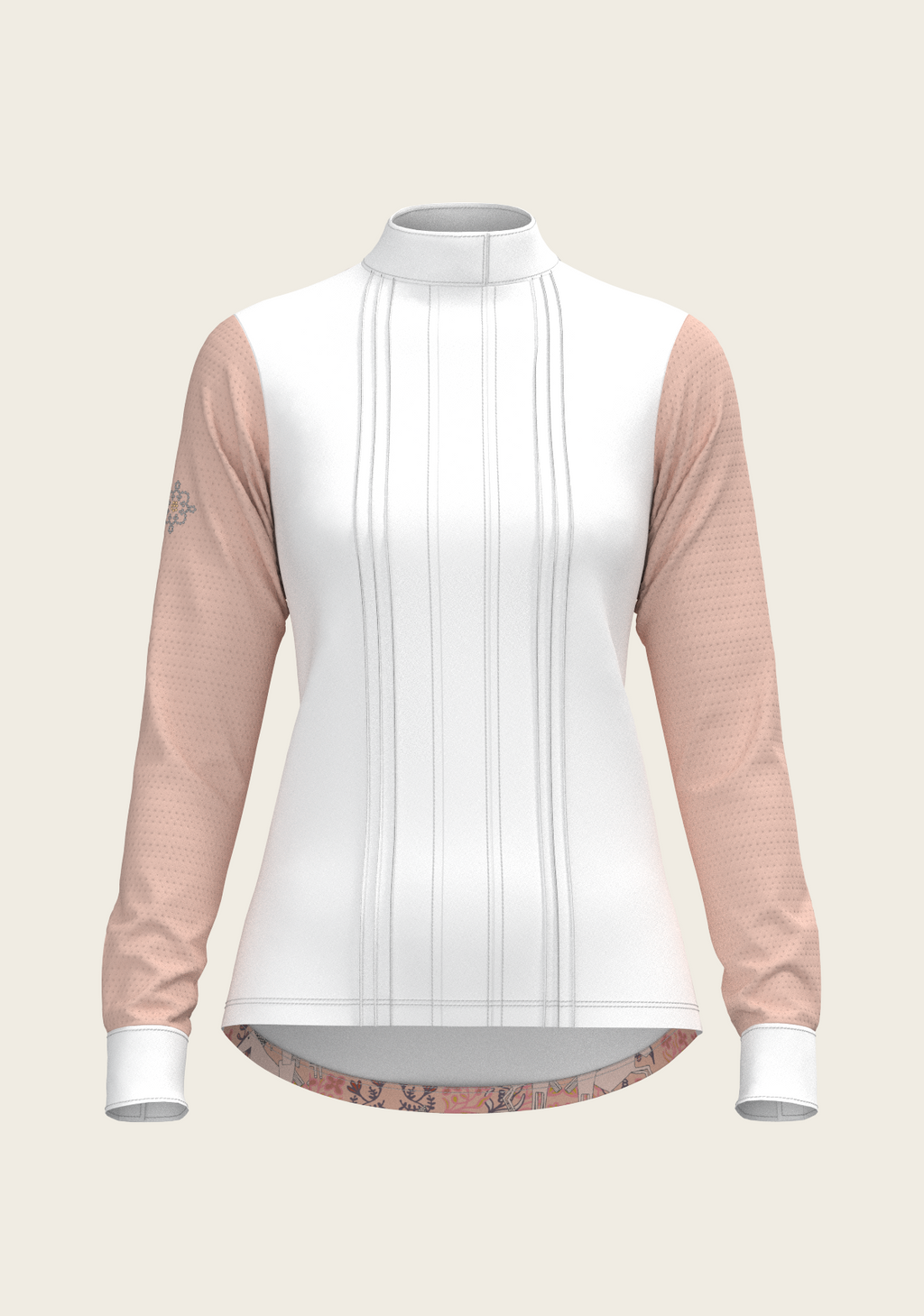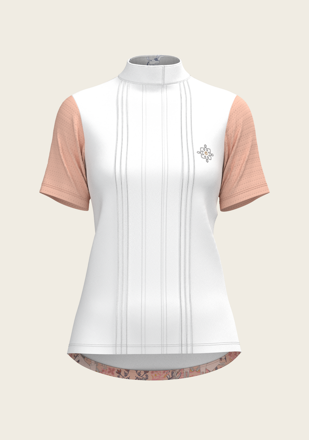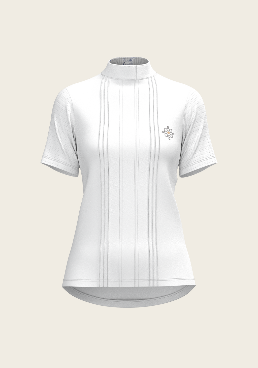 A formal looking show shirt made from luxurious technical fabrics. A hidden quarter zip is neatly constructed by a printed inner detailed fabric. On the front chest there is a Swarovski logo detail. Two hidden stud buttons easi...