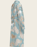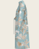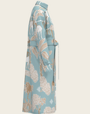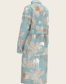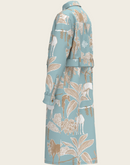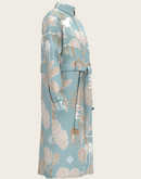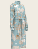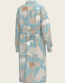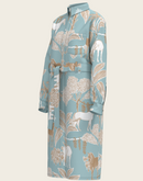 A collection of Espoir loose fitting shirt dresses made from a very light non-stretch fabric. The dresses have a center panel of buttons with one small custom gold Espoir button on the front and one on each cuff. A very loose, relaxed fit for an easy wearing stable to street style shirt. The fabric patterns are hand illustrated.