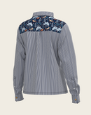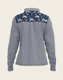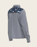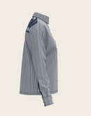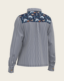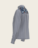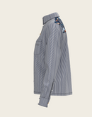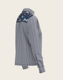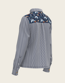 A new collection of Espoir shirts made from a very light non-stretch fabric. The shirts have a center panel of buttons with one small custom gold Espoir button on the front and one on each cuff. A very loose, relaxed fit for an easy wearing stable to street style shirt. The fabric patterns are hand illustrated