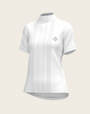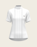 A formal looking show shirt made from luxurious technical fabrics. A hidden zip opens and closes the show shirt easily. Two hidden stud buttons easily closes the top collar. The two rows of three pleated details on the front of the shirt add a beautiful detail to this style. Cuffs have the custom Espoir button and the back of the collar, our signature Espoir ribbon detail. These show shirts are available in long and short sleeve.