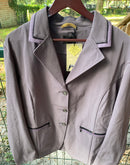 A fitted show jacket made from a lightweight stretchable fabric, stylishly executed with princess style lines. The front panel is closed with beautiful custom Espoir buttons which match smaller buttons on each sleeve.Tone on tone details on the collar and front pocket zips add sophisticated details to this jacket. A sporty, sophisticated styled equestrian jacket.